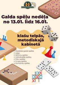 Galda spēļu nedēļa No 13.janvāra līdz 16.janvārim norisinās Galda spēļu nedēļa, kuras laikā skolēniem būs iespēja iepazīt dažādas spēles un …