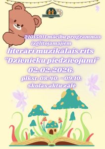 Literāri muzikālais rīts “Dzīvnieku piedzīvojumi” Literāri muzikālais rīts 2.februārī “Dzīvnieku piedzīvojumi” tiek organizēts 21015911 mācību programmas izglītojamajiem. Pasākumā bērni dosies …